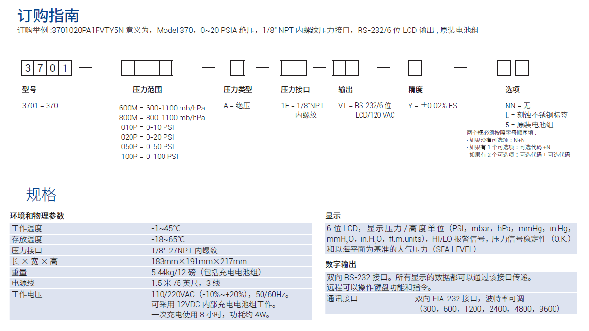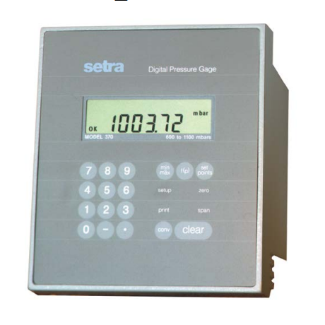 Model 370 高精度数字式压力计是采用微处理器的多功能测量仪器,它将西特(Setra) 的SETRACERAMTM 敏感元件、先进的数字电路和成熟的固化软件结合起来,系统的精度优于±0.02%FS。Model 370 采用6 位液晶显示器对压力和数据进行显示,亦可通过一个双向EIA-232 接口来输出这些数据,利用面板上的功能键和数字键可很方便地进行工程单位转换,记录最小/ 最大值,设置高低报警点和波特率,进行标定等,上述功能同样可通过通讯接口来完成。根据用户需要Model 370 可以三种不同的方式输出数据;连续输出、间歇输出、有请求时输出。Model 370 还提供一个特选的充电电池组,所以它不仅可作为实验室仪器,还可作为一个便携式的精密压力计和现场校准器使用。