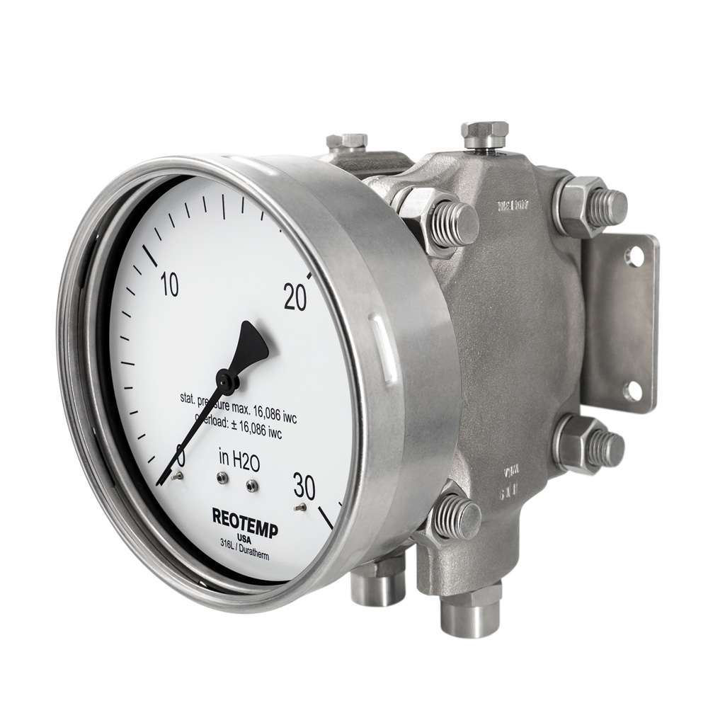 Reotemp D50 系列压差计广泛应用于加工工业中需要坚固耐用的全不锈钢结构的异种液体和气体。这款高精度压差表具有大刻度盘面、270° 全弧度和可选的 Hi-Vis™ 高透视刻度盘,可在多种不同的照明条件下轻松读取数据。高、低压外壳具有冲洗压力腔内积聚的固体颗粒的功能。压力腔内装有耐腐蚀的隔膜,隔膜内充满液体以补偿静压。外部机身和工艺端口的尺寸与大多数现场安装型差压变送器相同,便于安装到歧管上。