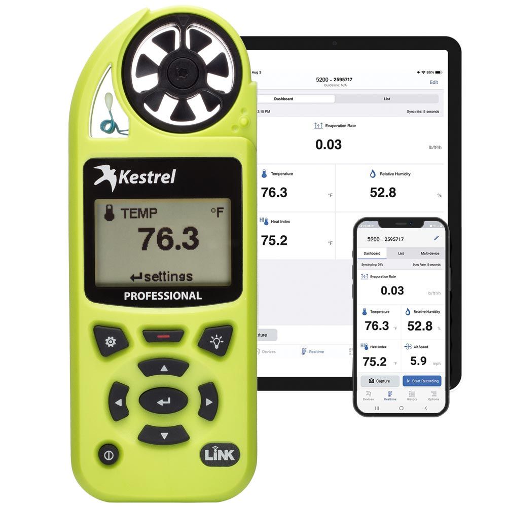 配对Kestrel5200与可选的Kestrel叶片安装了记录在一天之内免提测量。而对于最大的功能,选择Kestrel5200与链路来传送实时测量到您的手机或平板电脑,当你在范围之内。iOS和Android(即将推出)的Kestrel链接的应用程序将提供移动设备上的警报,让你知道什么时候情况发生了变化。