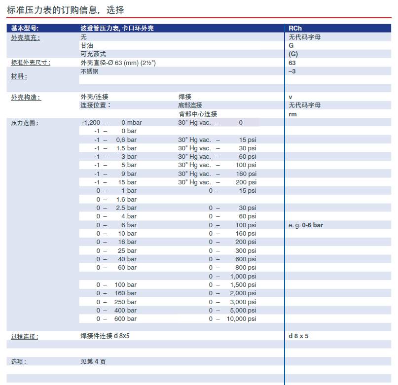 订购信息,标准压力范围,选项: