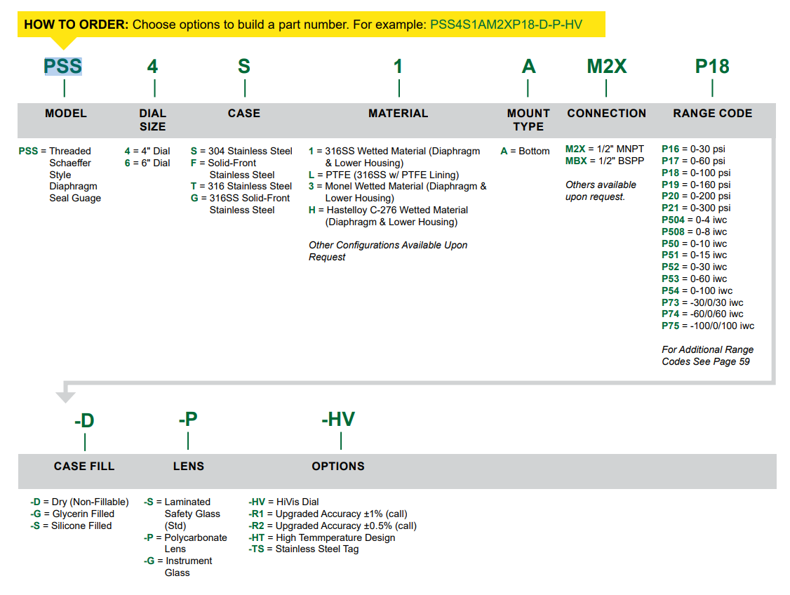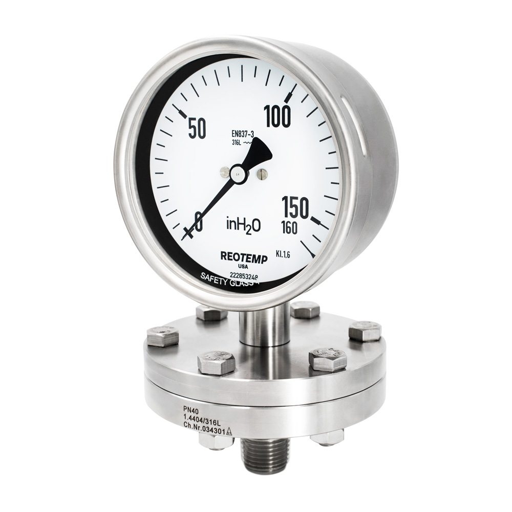 Reotemp 的 PSS 系列是 Schaeffer 式密封压力表,带有隔膜传感元件,用于测量气体、液体或固体的压力。机械隔膜密封设计最大程度地减少了与热有关的精度误差,是低压应用的理想选择。